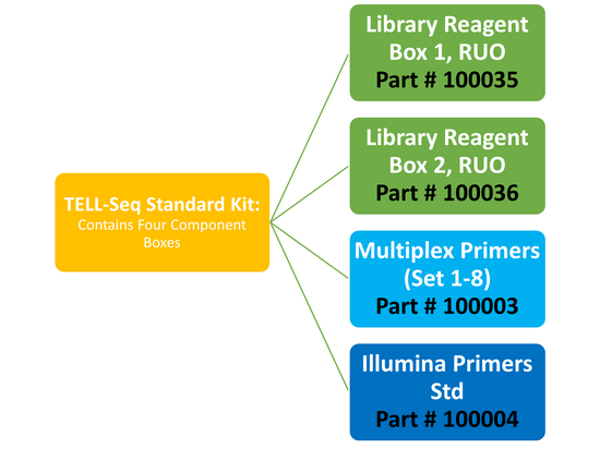 A set of Standard TELL-Seq kit enables you to prepare as many as 12 small genome libraries or 4 large genome libraries. The standard kit includes the following: